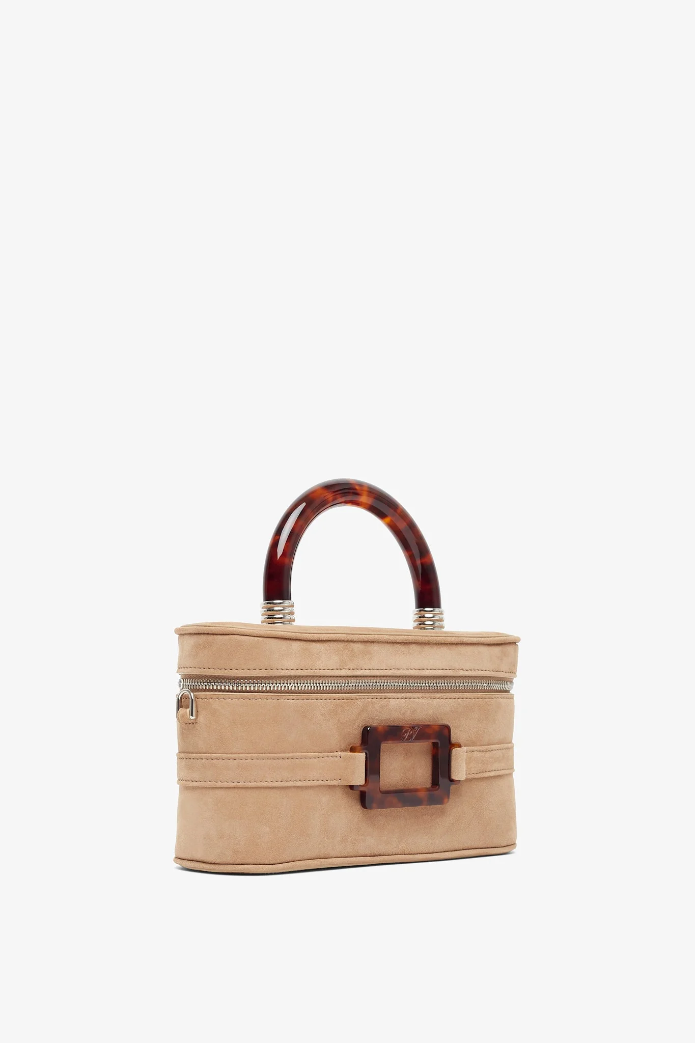Beige suede mini bag from Roger Vivier. The Belle Vivier mini bag are made in suede with a resin tortoise effect handle, buckle and removable shoulder strap.