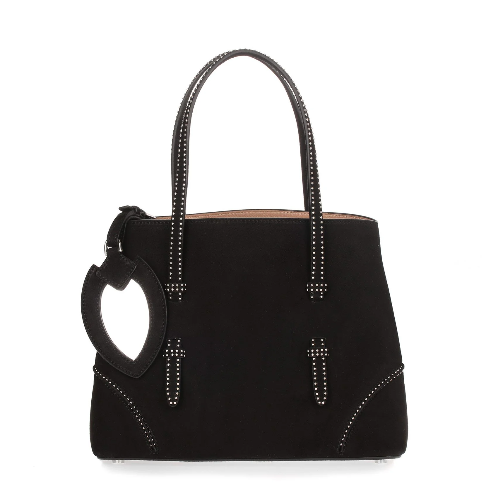 Black suede small tote with studded detailing from Alaia. The tote has optional press-studs on the side, silver-tone stud detailing, and an optional cross-body strap. An optional logo engraved leather covered mirror completes the look.