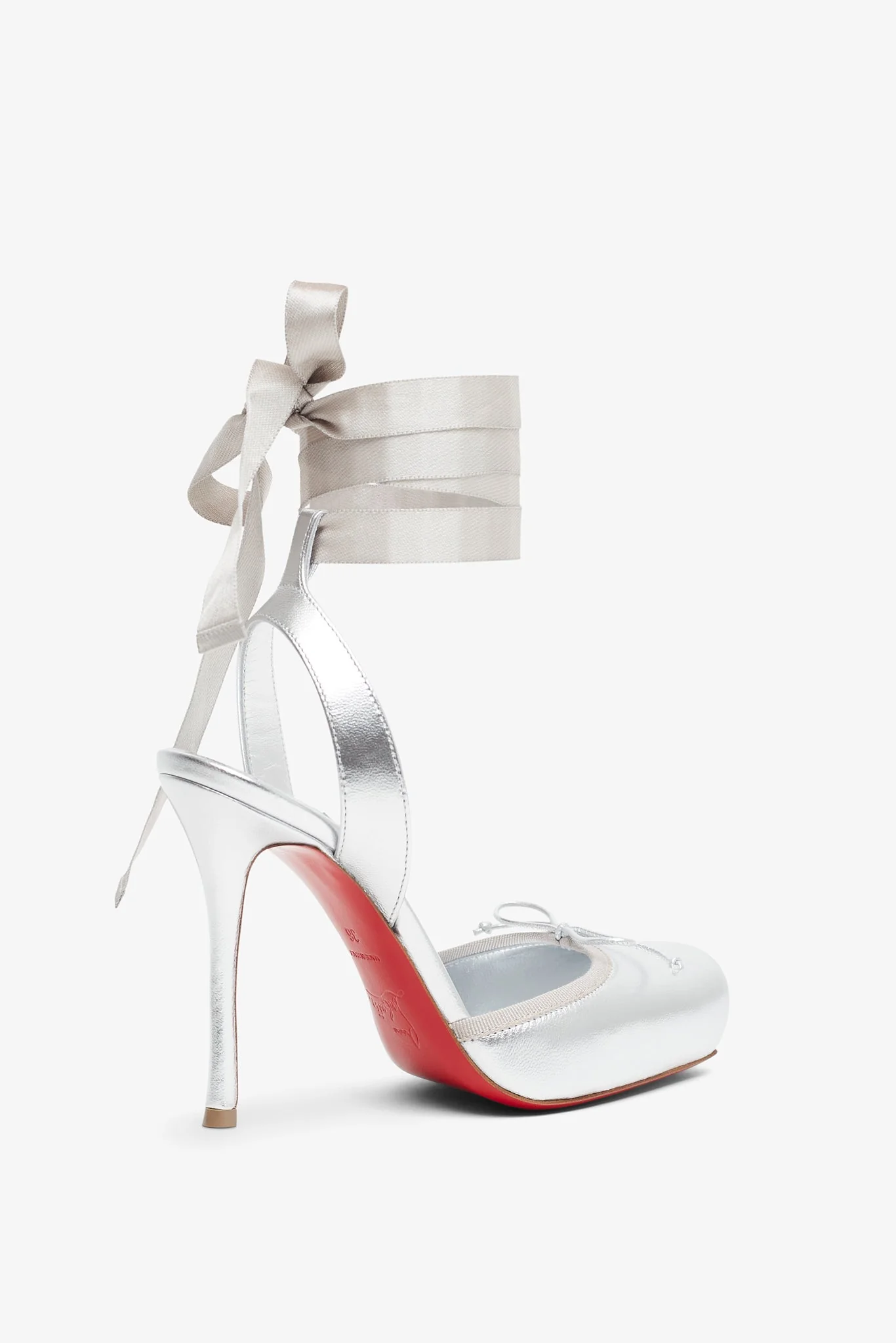 Silver leather pumps from Christian Louboutin. The Cassia lace up pumps are made from silver laminated lamb nappa leather with tonal silver lining, and set on a 100mm stiletto heel. It is complete with a ribbon ankle tie and a small tonal bow.