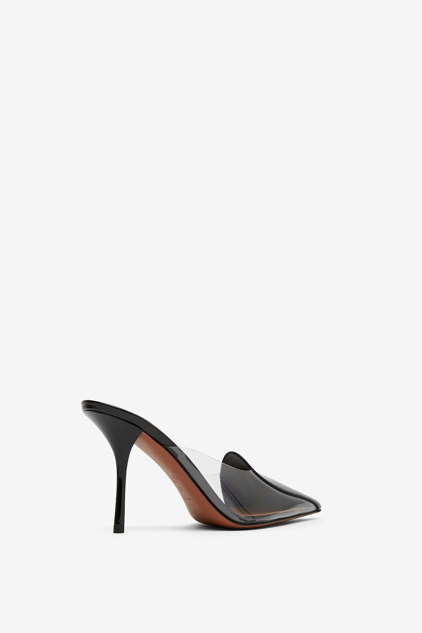 Patent black and transparent mule pumps from Alaïa. The Coeur abstrait patent leather mule pumps are asymmetrical and made in patent black calfskin leather and transparent polyurethane, feature a half-heart cut in front and sit on a 90 mm heel.