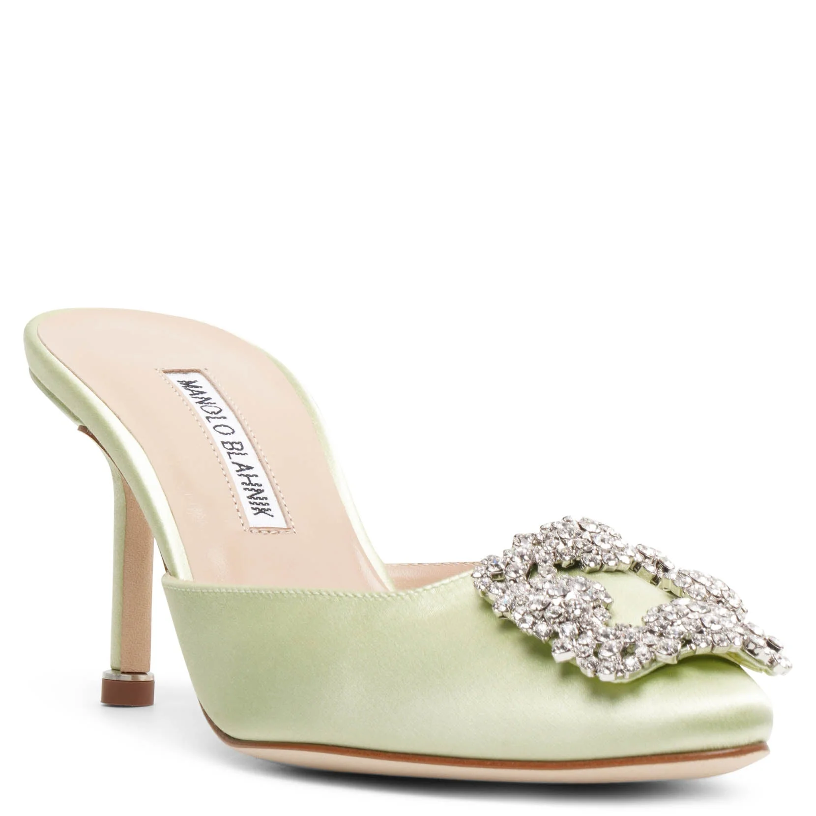 Light green satin mules with a clear crystal embellishment from Manolo Blahnik. The Hangisimu is set on a 70mm slim stiletto heel with a slightly pointed toe complete with a clear jewel embellishment at the toe.