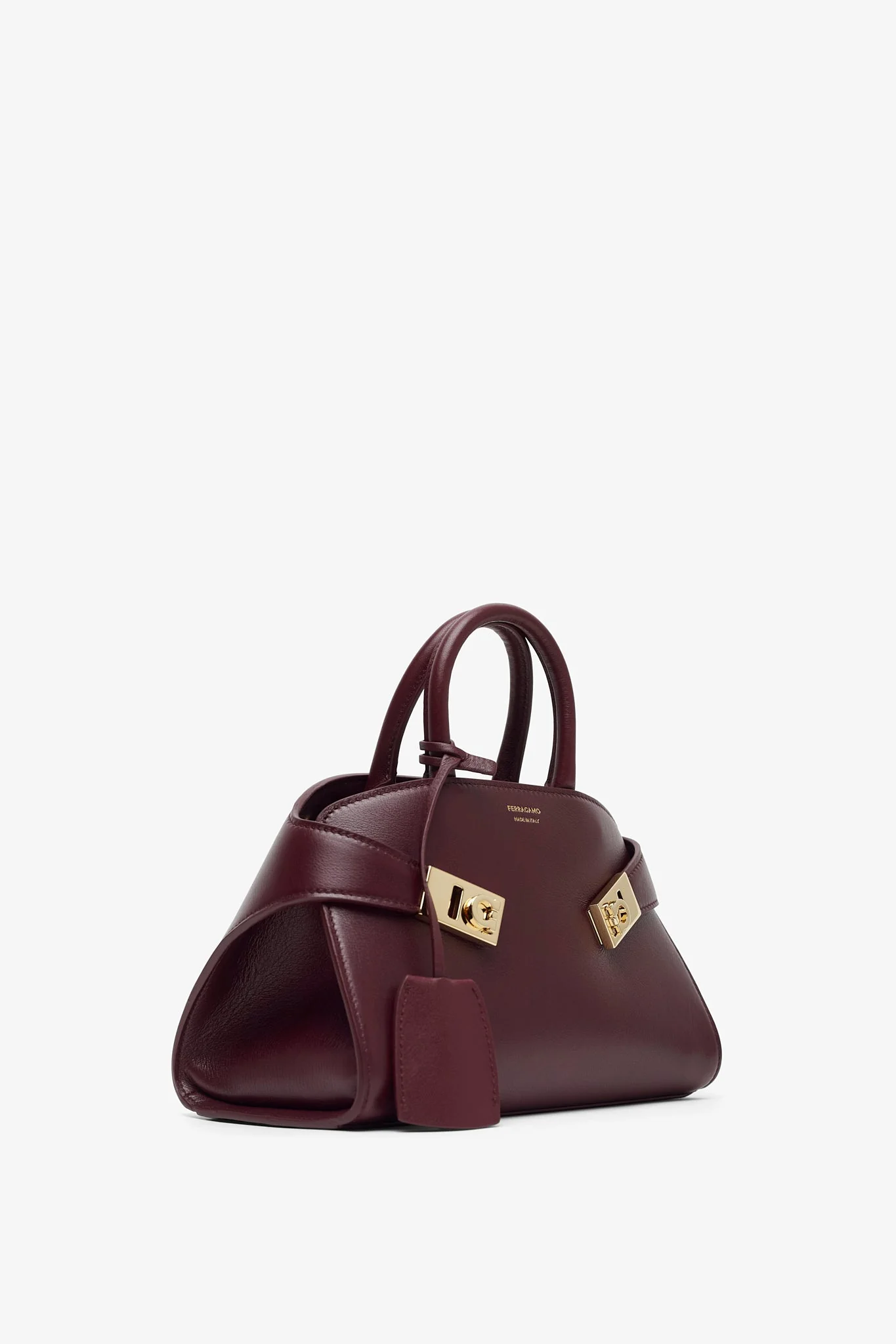 Burgundy leather mini bag from Ferragamo. The Hug mini bag is made from calfskin leather with rounded edges, featuring two straps that emanate from the back quadrant wrapping the billows, fastening at the front via two golden Hug buckles. It is complete with a keychain charm along with a detachable shoulder strap.