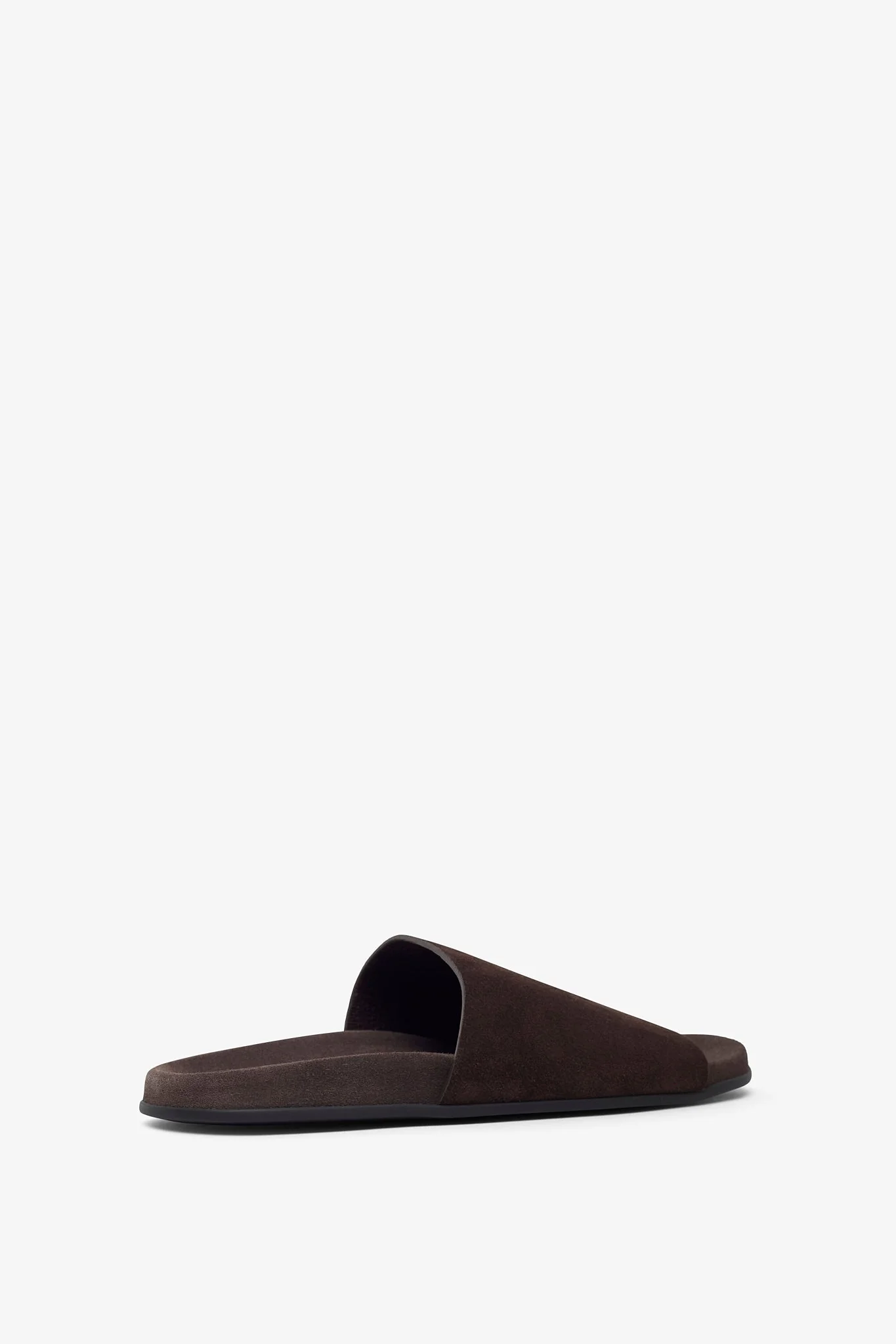 Dark brown suede slip-on slides from The Row. The Hugh slides are made in soft suede with contoured footbed and rubber sole.