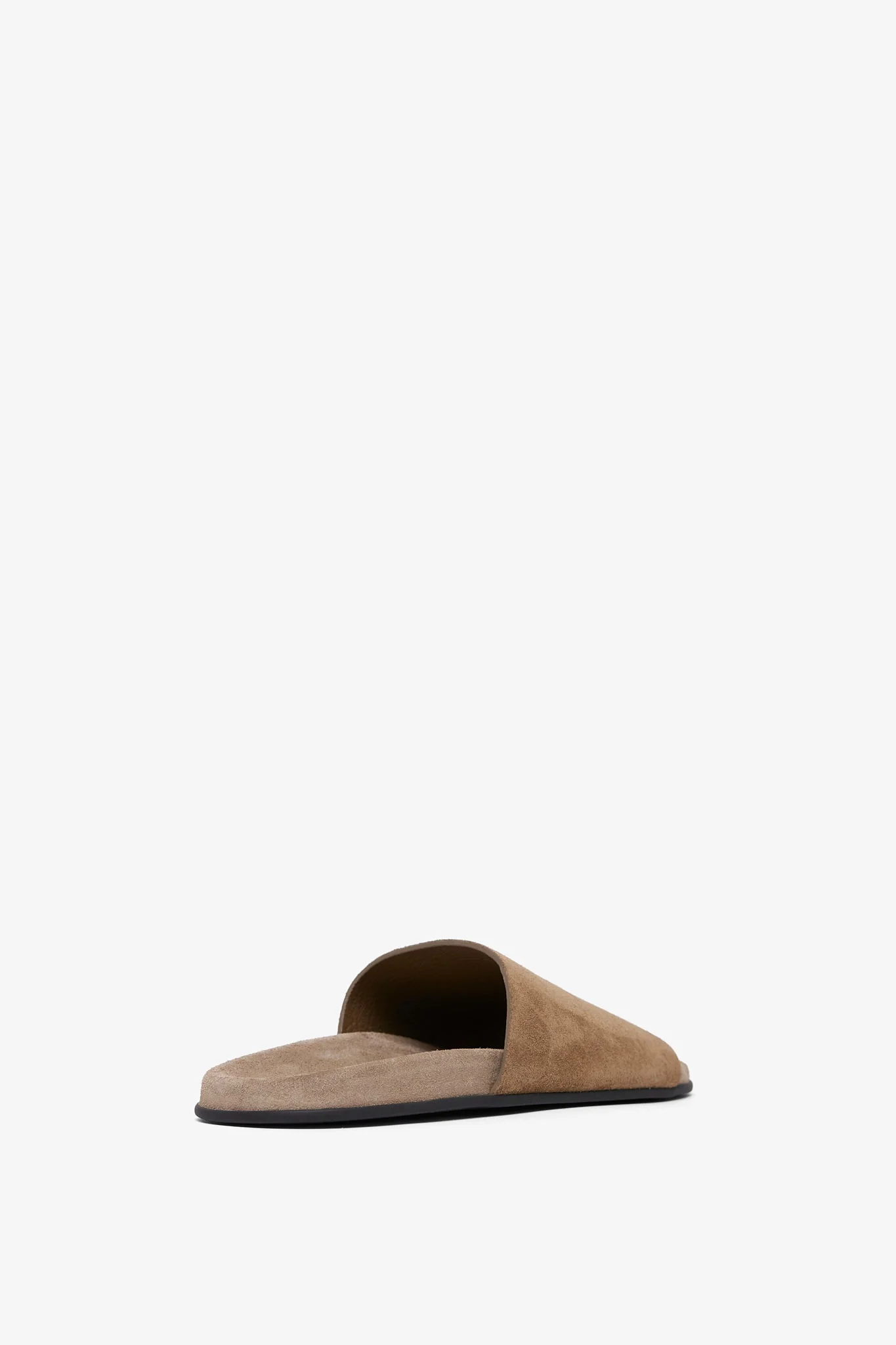 Green suede slip-on slides from The Row. The Hugh slides are made in soft suede with contoured footbed and rubber sole.