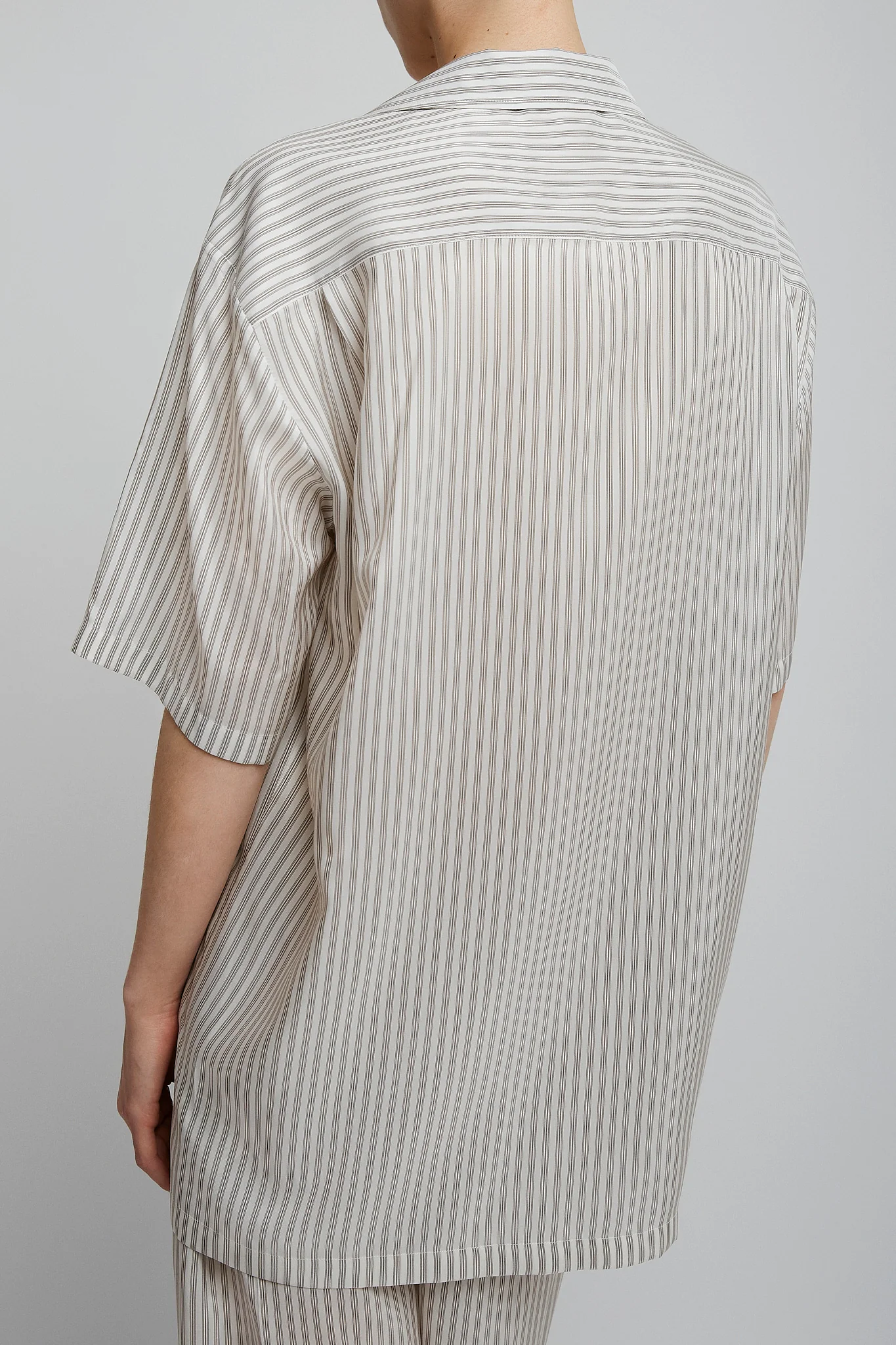 White and grey short-sleeved button-up shirt in fluid striped silk with front patch pocket, exposed front button placket, and relaxed fit.