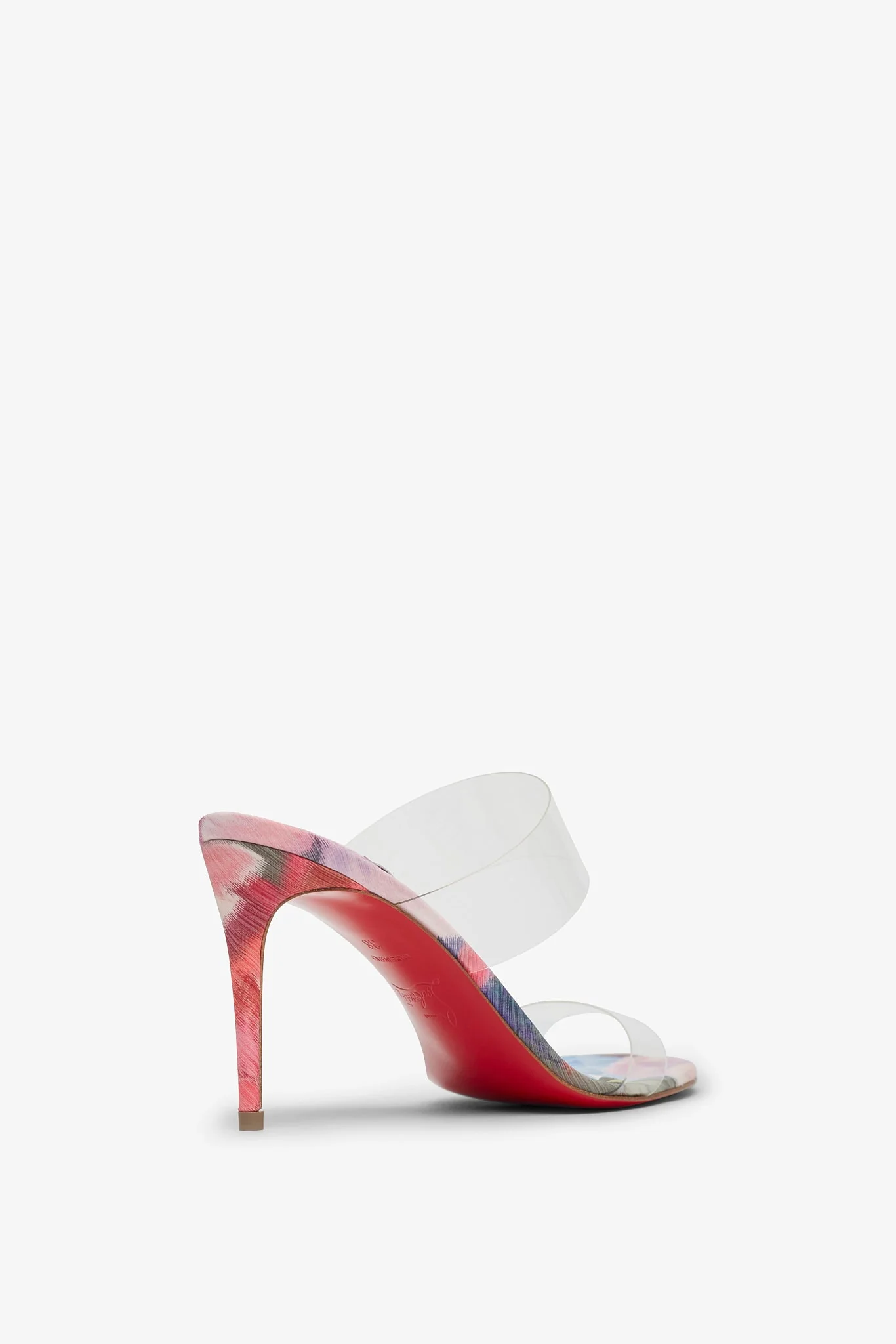 Pink floral satin mules from Christian Louboutin. The Just Nothing sandals are made of floral-printed chiné fabric with a transparent TPU upper, set on a stiletto heel measuring 85mm.