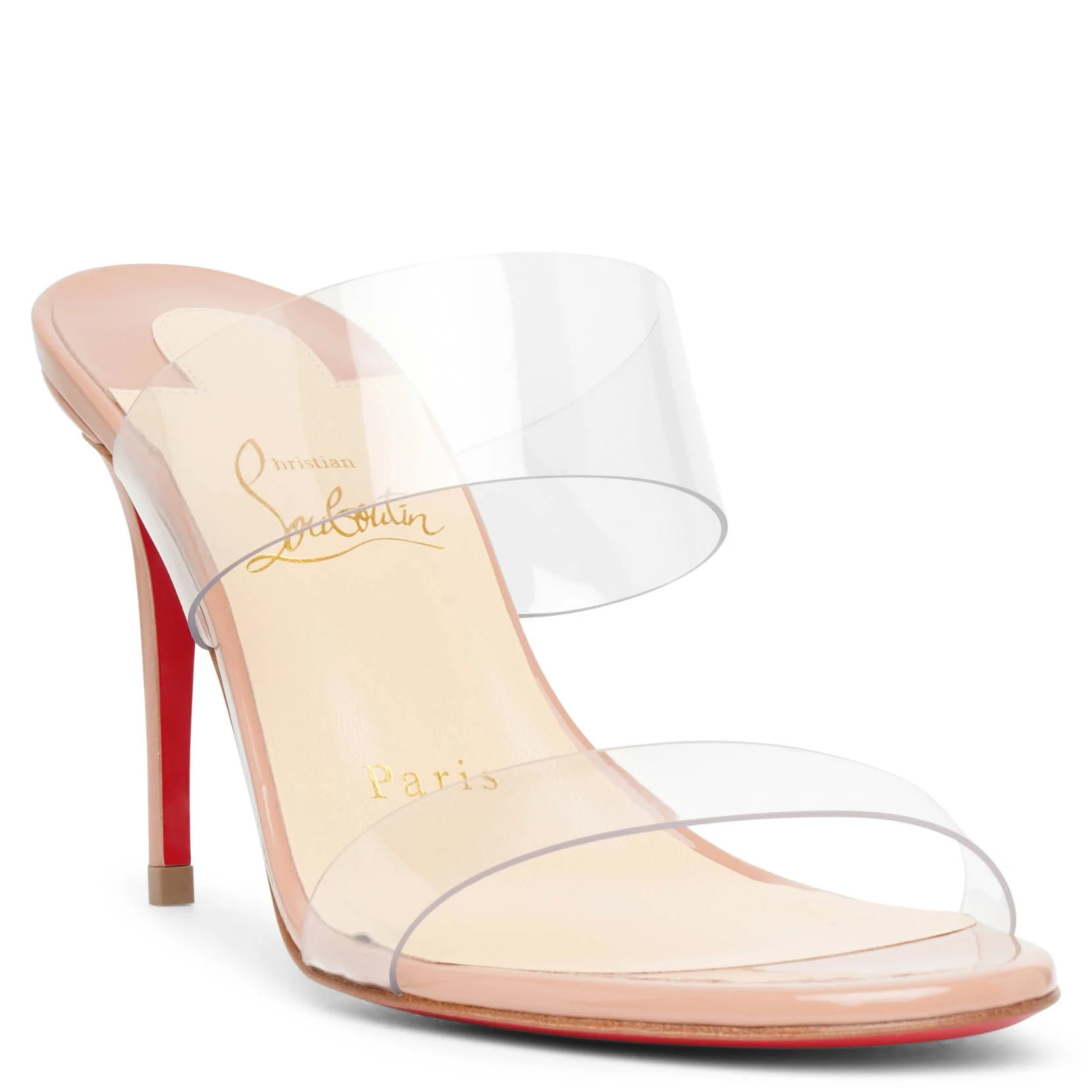Beige patent leather and PVC sandals from Christian Louboutin. The Just Nothing sandals are made of nude patent leather with a transparent PVC upper, set on a slim stiletto heel measuring 85mm.