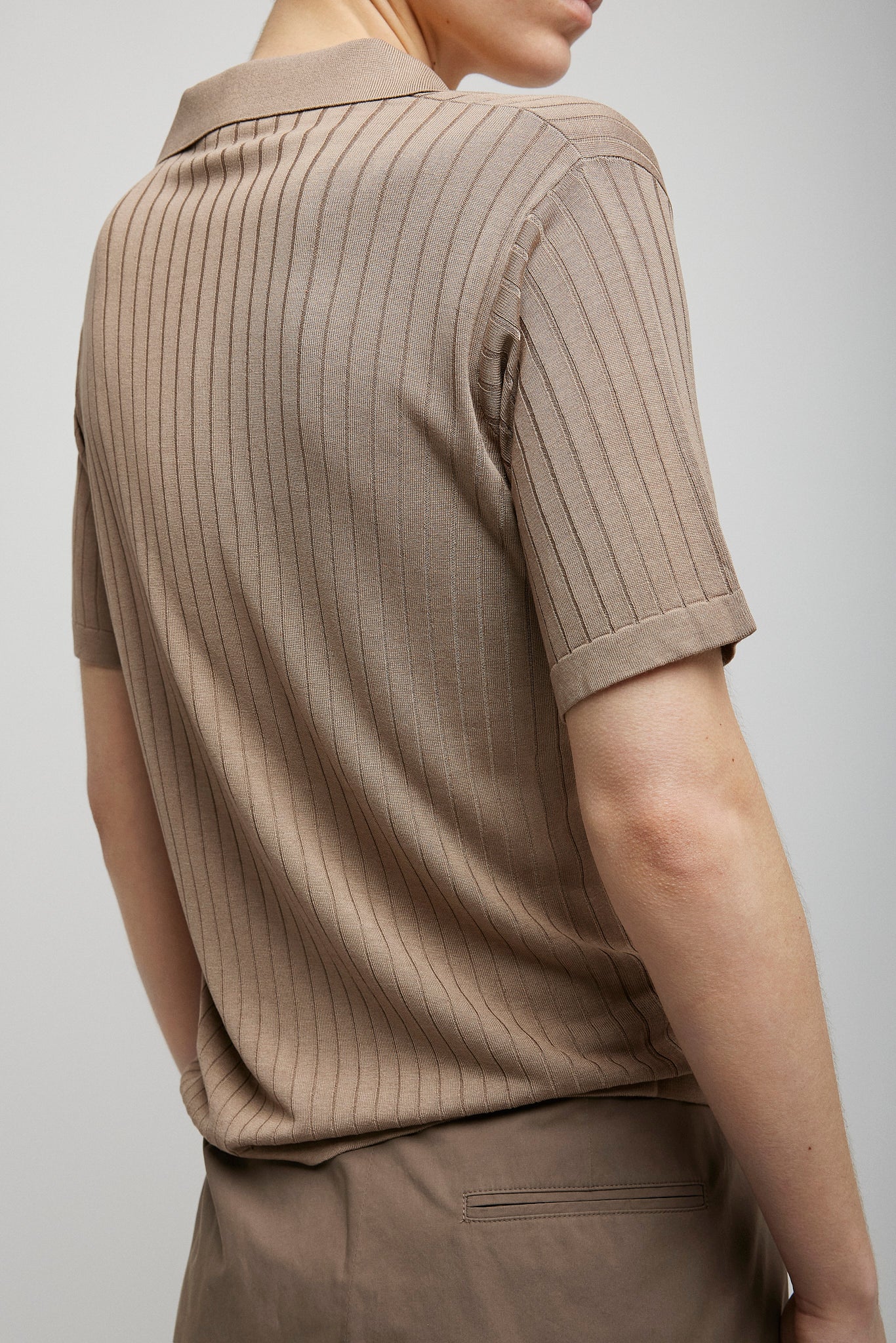 Beige short-sleeved polo top in fluid viscose silk with open front placket, ribbed collar, and slim fit.