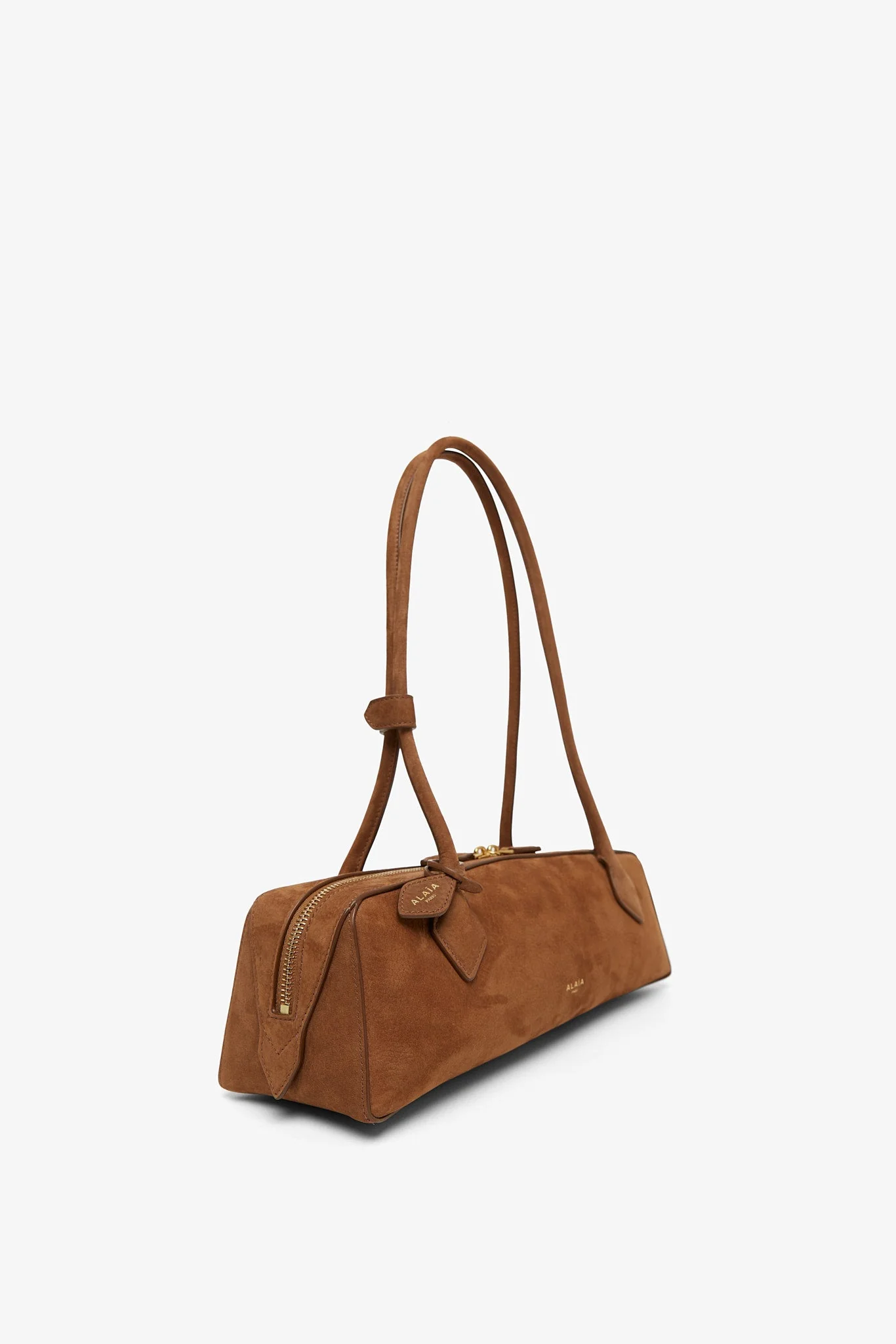 Brown nubuck suede shoulder bag from Alaïa. The Le Teckel bag is made of nubuck suede with extended shoulder straps, a two-way zip fastening along the top, complete with a slip pocket inside to fit you cards.