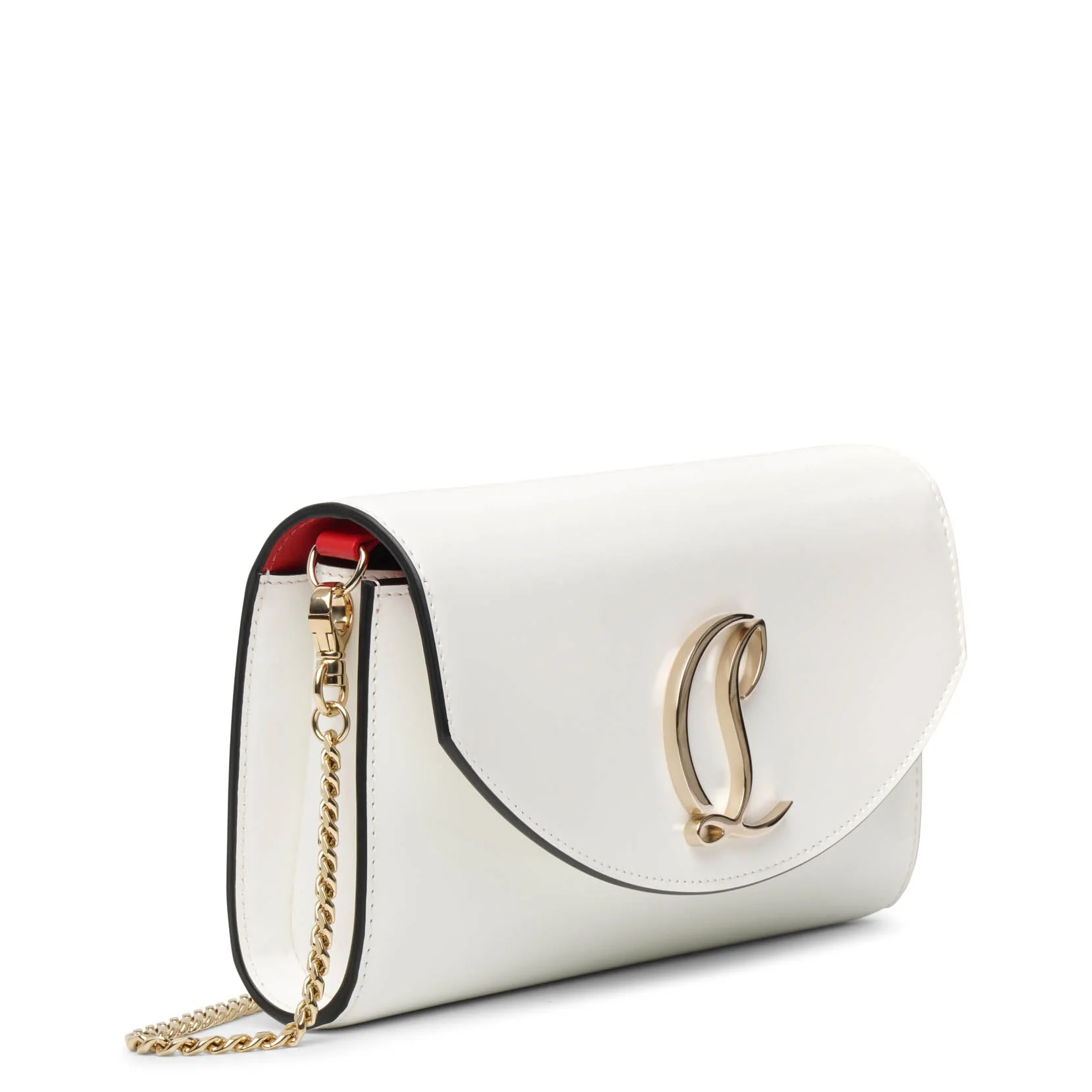 White patent leather wallet on chain bag from Christian Louboutin. The Loubi54 wallet is made of white abrasivato leather and is adorned with a gold CL monogram. It can be carried by hand or over the shoulder with the detachable golden chain strap.