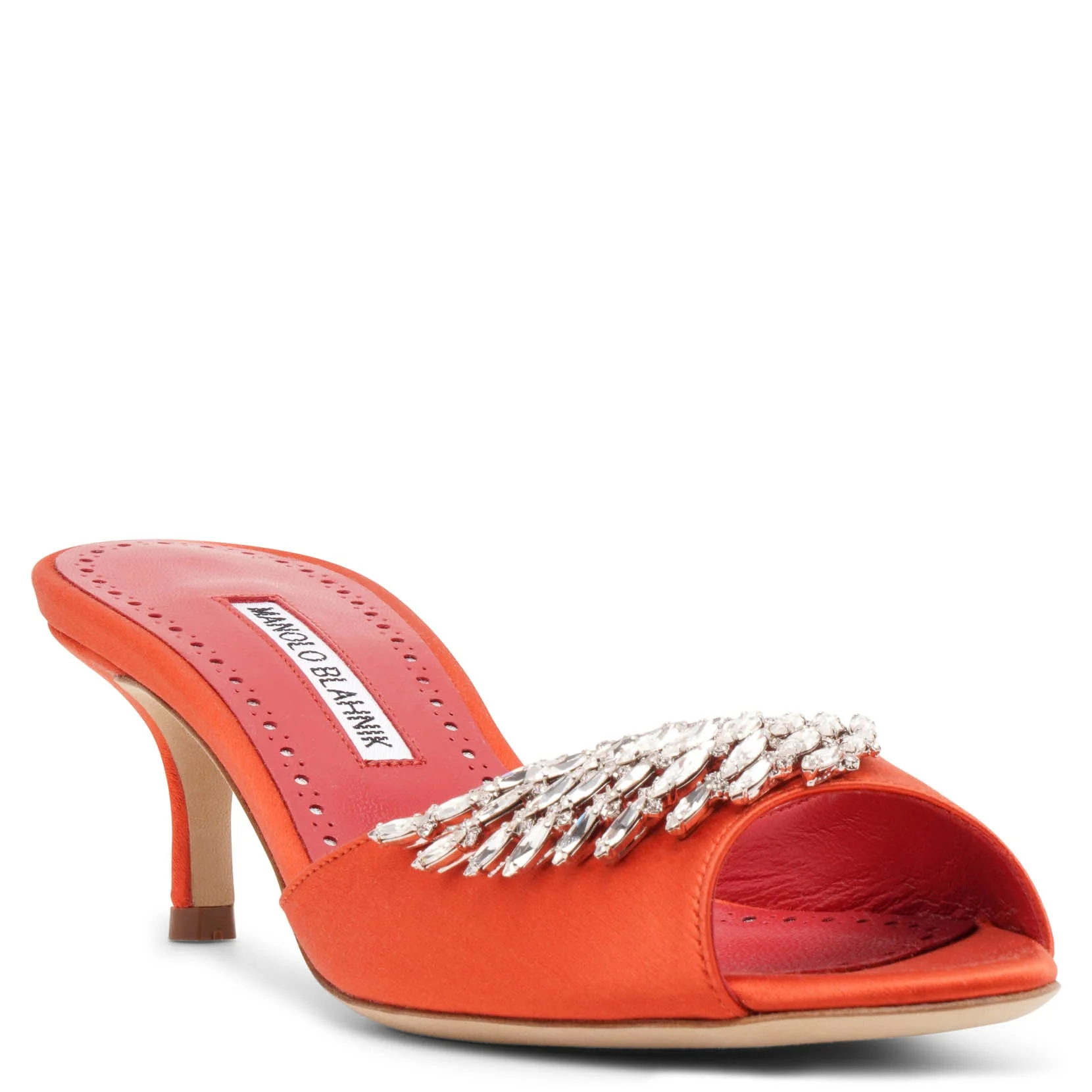 Red satin mules from Manolo Blahnik. The Lumada mules are made of satin featuring a clear crystal embellishment, open toes and is set on a stiletto kitten heel measuring 50mm.