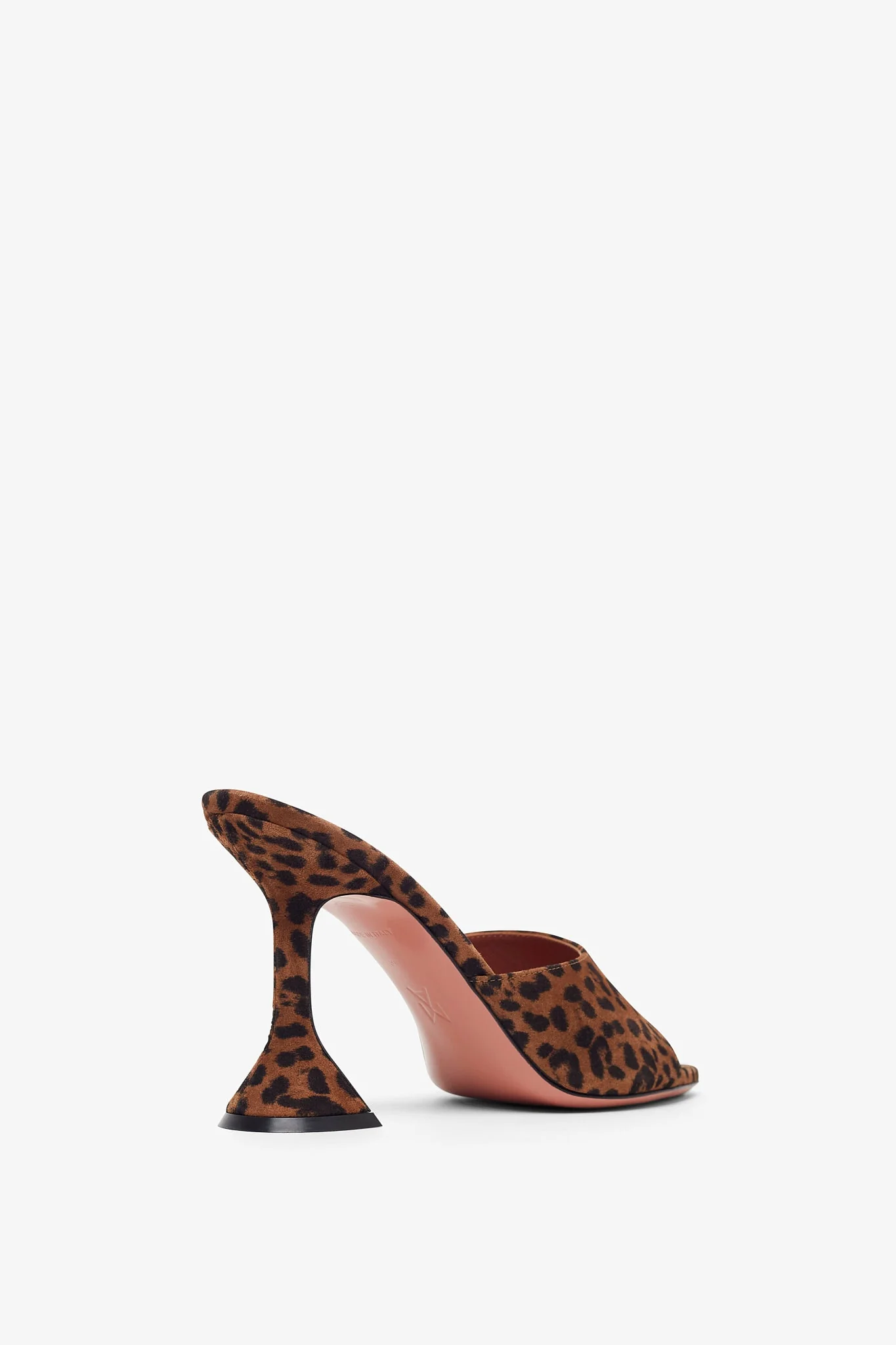 Leopard suede mules from Amina Muaddi. The Lupita mules are made of suede with a square toe, leather lining and insole, featuring the designer’s signature "Martini" heel measuring 95mm.