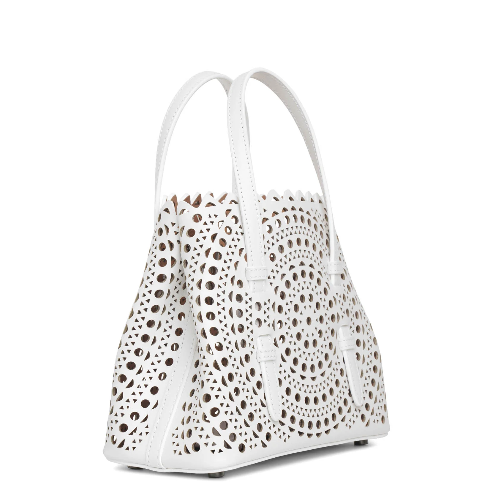 White leather tote bag from Alaïa. The tote has two top handles and an optional cross-body strap, a detachable mirror inside along with an unlined finish.