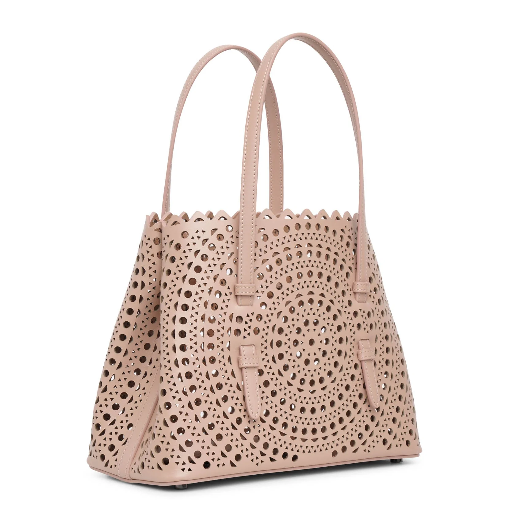 Beige leather tote bag from Alaïa. The Mina tote has two top handles, an optional crossbody strap along with a detachable interior zipped pouch, complete with an unlined finish.