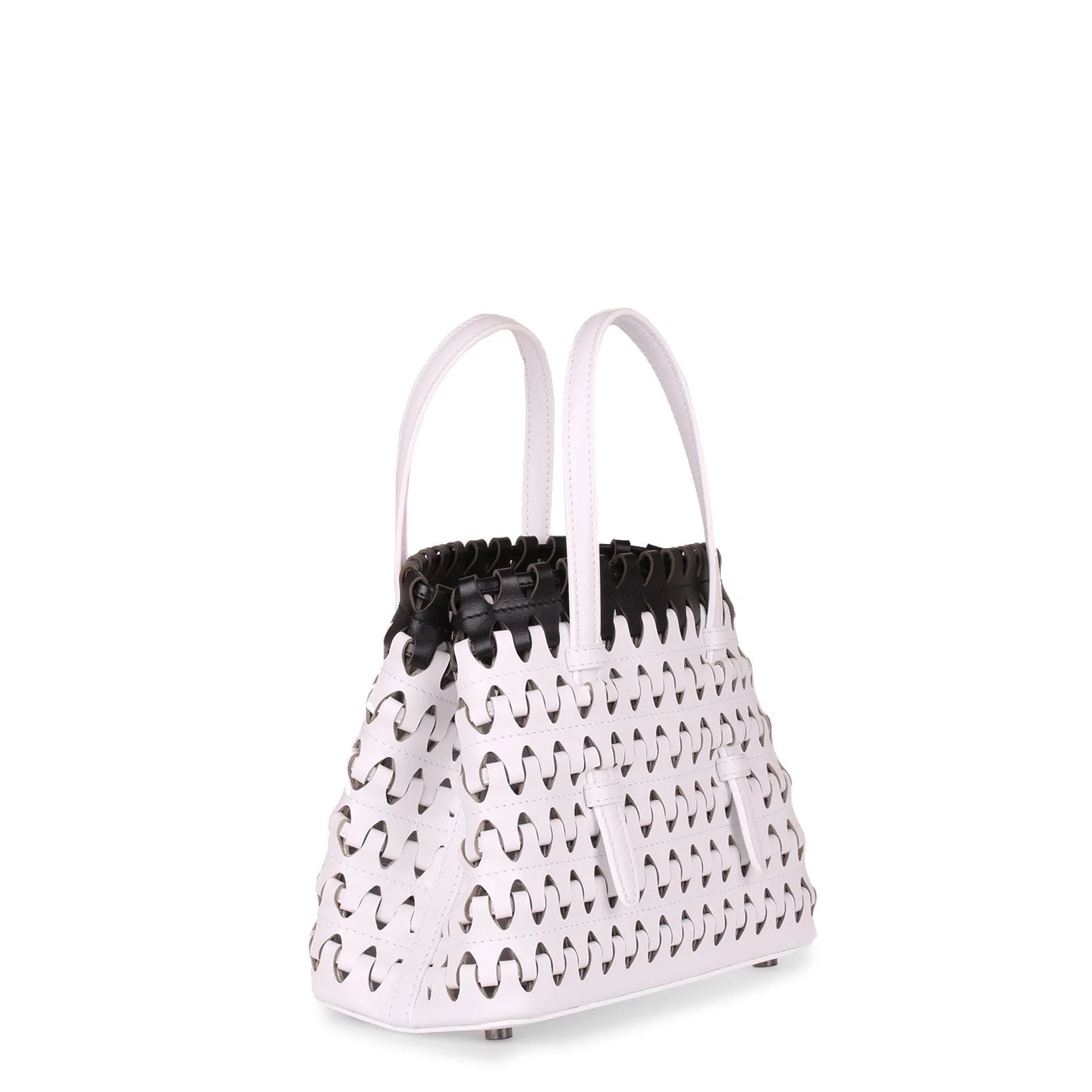 White and black leather mini tote with weave detailing from Alaia. The tote has optional press-studs on the side, laser-cut and weave detailing, and an optional cross-body strap. An optional logo engraved leather covered mirror completes the look.