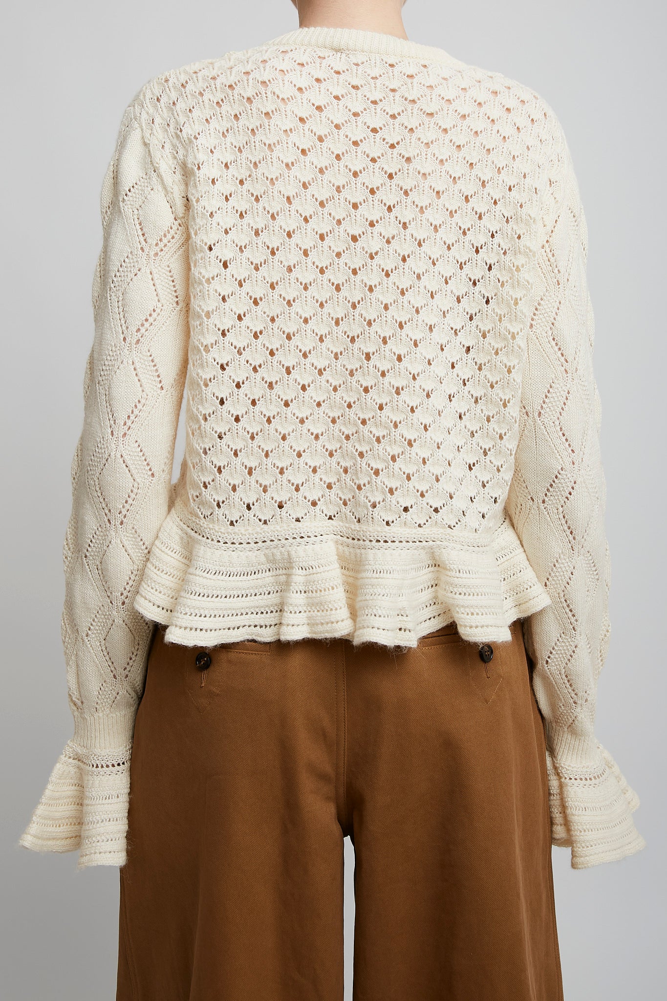 White alpaca wool pointelle knit from Chloé. The Ruffled knit cardigan is made in silk, alpaca wool and cotton featuring a flouncy hem and cuffs, with tonal Chloé logo embroidery and fabric-covered buttons at the front.
