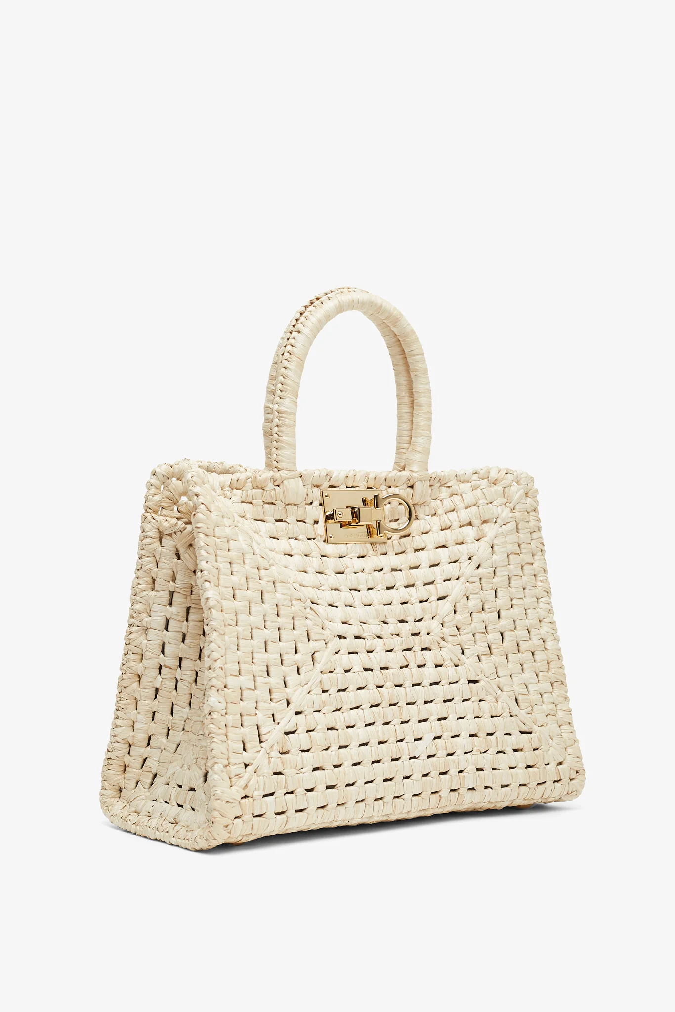 Beige handwoven raffia tophandle bag from Ferragamo. The Studio box bag is made of handwoven raffia, featuring a Gancini detail closure, canvas lining with a removable internal clutch along with square metal feet studs.