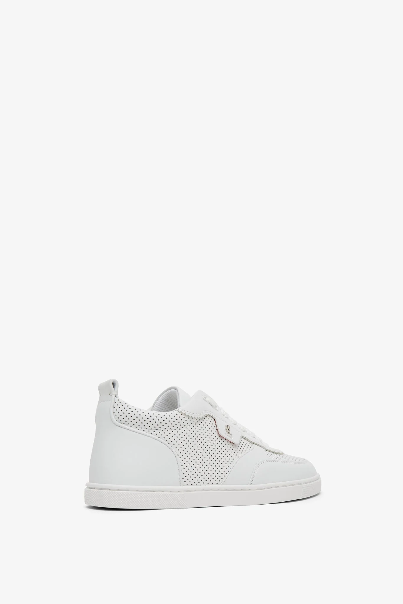 White leather sneakers from Christian Louboutin. The Tutti Rui low-top trainer is made in white leather with tonal finishes, featuring a lace-up top and a heel loop, embellished with the signature CL logo.Red rubber sole